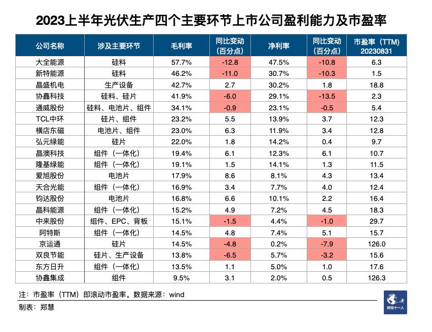 通威股份、协鑫科技、大全能源、新特能源,以及未上市的东方希望,是硅料环节五大巨头。上半年,几家上市公司仍然保持着较高的毛利率,但相较去年同期明显下滑(见下图,标红为毛利率净利率降低的公司)。