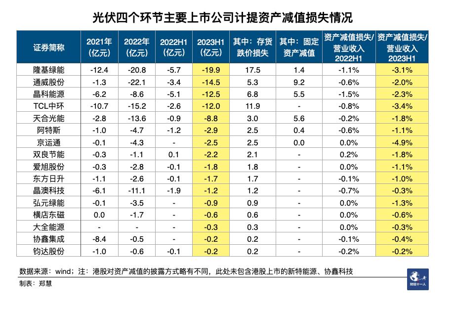 其中,隆基绿能上半年计提了19.9亿元资产减值损失,接近2022年全年水平,其中17.5亿元为存货跌价损失。此外,通威股份、晶科能源、TCL中环、天合光能等头部公司的减值准备也大大增加。