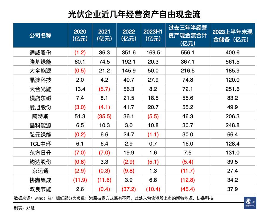 除通威、隆基以外,对比其他几家头部一体化公司:晶澳科技、天合光能自身造血能力较好,但晶澳科技的现金储备最少;晶科能源、阿特斯现金储备较多,但自身造血能力一般,其中,晶科的经营资产自由现金流在今年上半年才稍有起色,阿特斯则不太稳定;东方日升在头部一体化公司中,资金实力相对较弱。