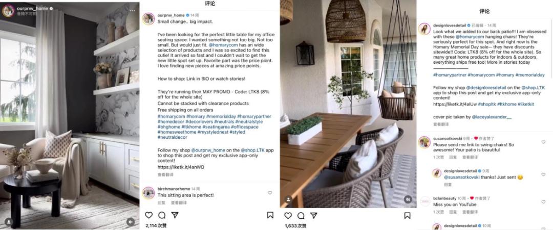 另一个案例是国内领先的家居品牌Homary。众所周知,家居是一个大众化的短尾需求。市场竞争激烈,消费者在选择时也容易眼花缭乱。过去,消费者选择家居品牌时,更多是偏向头部品牌,这让非头部品牌营销面临很大压力。而Homary在与LTK合作后,通过活动、专属广告以及Gifting等项目,带动品牌在LTK红人社群的广泛传播,进而激发了红人的传播效应,有600+红人主动为其带货。