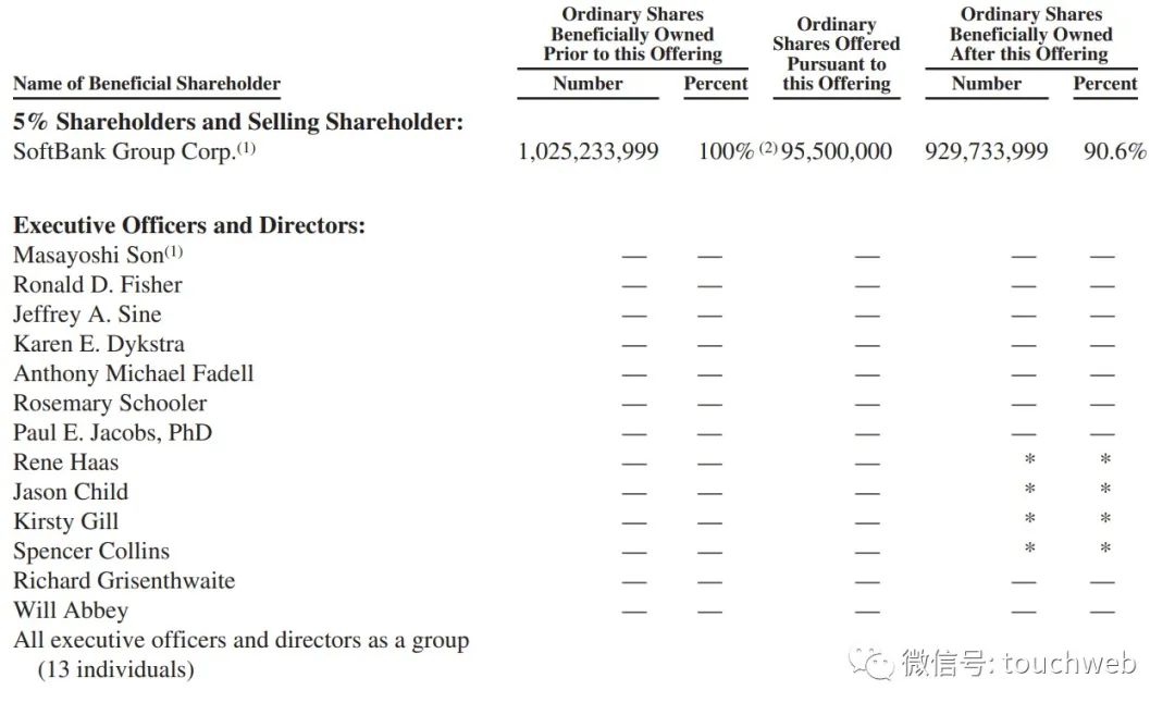 此次IPO前,软银集团实益拥有ARM 100%股份;IPO后,软银将拥有90.6%股份,若行使绿鞋计划,则软银持股会降至89.9%。