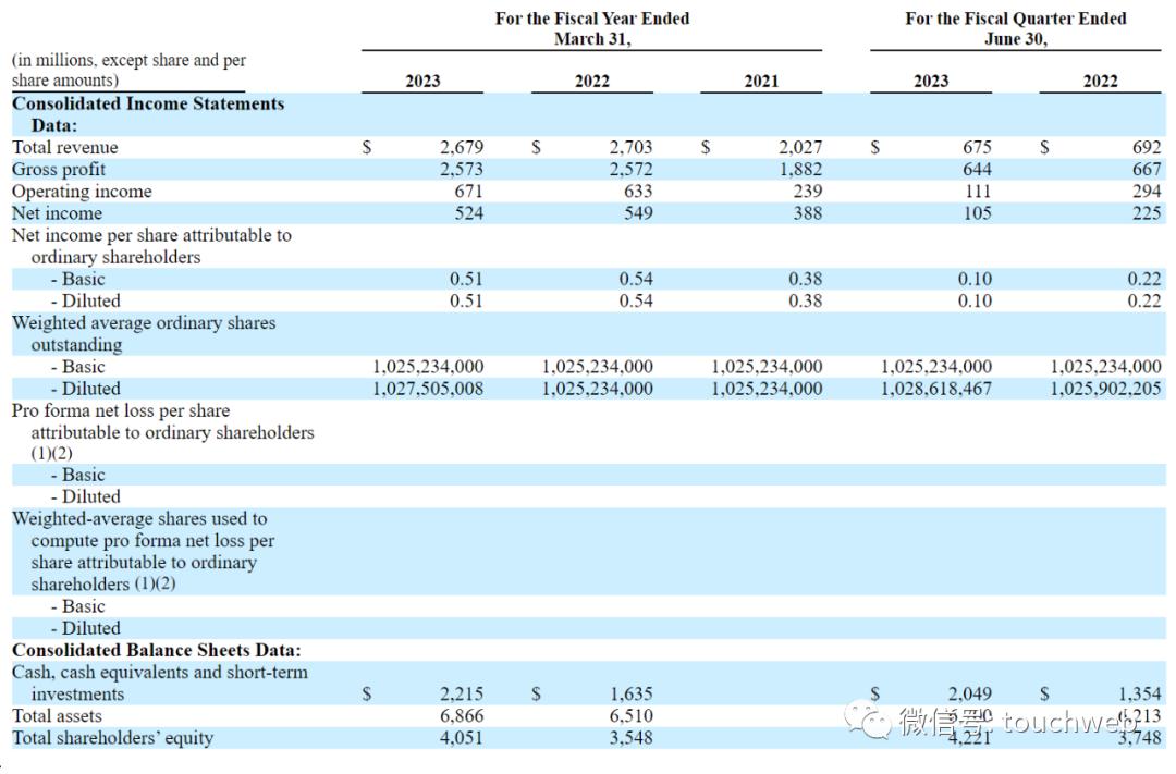 Arm是以每年3月31日为一个财年。招股书显示,Arm在2021财年、2022财年、2023财年营收分别为20.27亿美元、27亿美元、26.79亿美元;毛利分别为18.82亿美元、25.72亿美元、25.73亿美元。