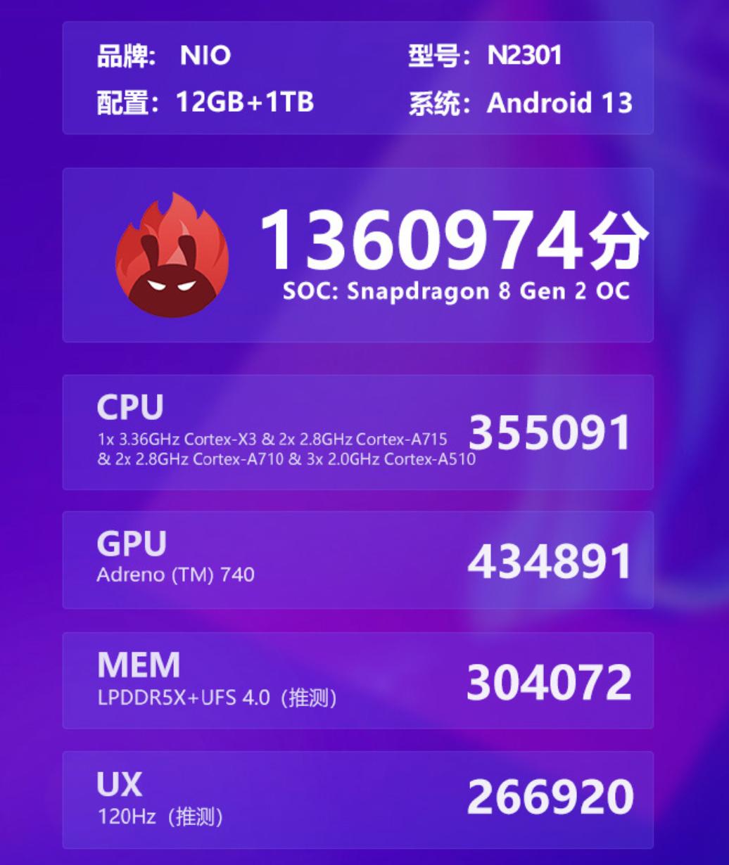 从安兔兔给出的数据图来看,NIO Phone的总分为1360974分,其中 CPU成绩为355091,GPU 成绩为434891,MEM成绩为304072,UX成绩则是266920。从这个分数来看,它配备的是第二代骁龙8领先版,与普通的第二代骁龙8相比,在主频方面更为激进,也是当下安卓手机市场中最旗舰的处理器。
