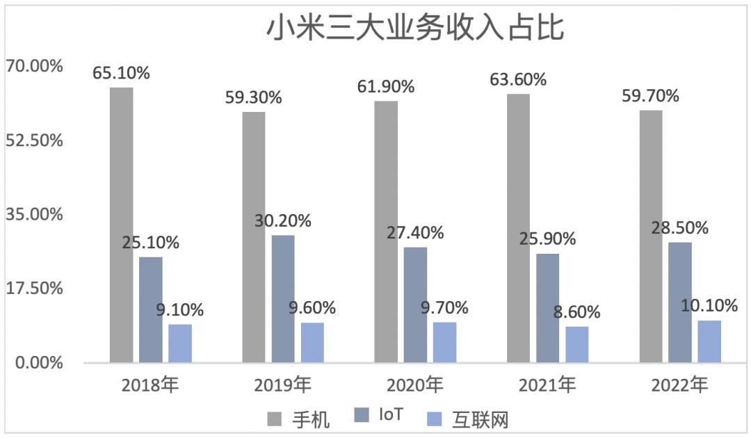 在收入占比方面,2018年至2022年,智能手机、IoT与生活消费产品、互联网服务三大业务收入占总营收比重变化不大,2022年为59.7%、28.5%和10.1%。