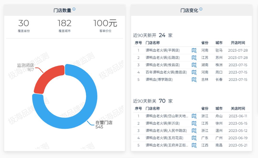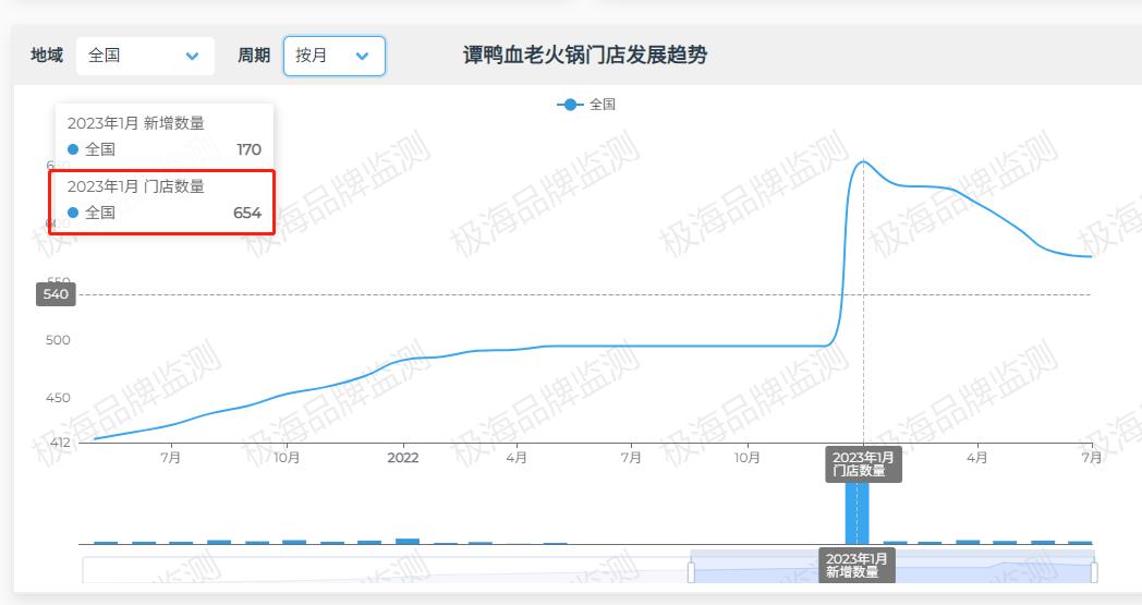 而根据极海品牌监测数据显示,2023年1月,谭鸭血全国总门店数有654家。到了8月31日,谭鸭血在全国的在营门店则变成了545家。