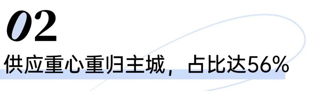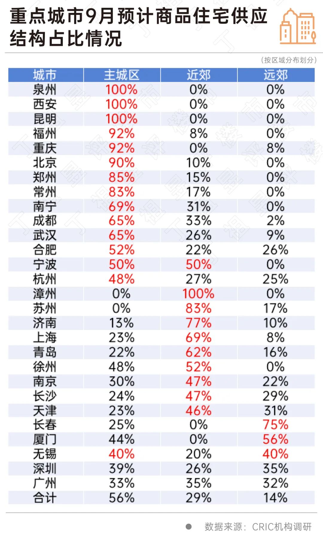 从供应结构各项目区域分布来看,重点城市主城、近郊、远郊占比结构为56%、29%和14%,与上月略有不同,本月供应量质齐增,供应重心逐步由远郊向主城区转移。