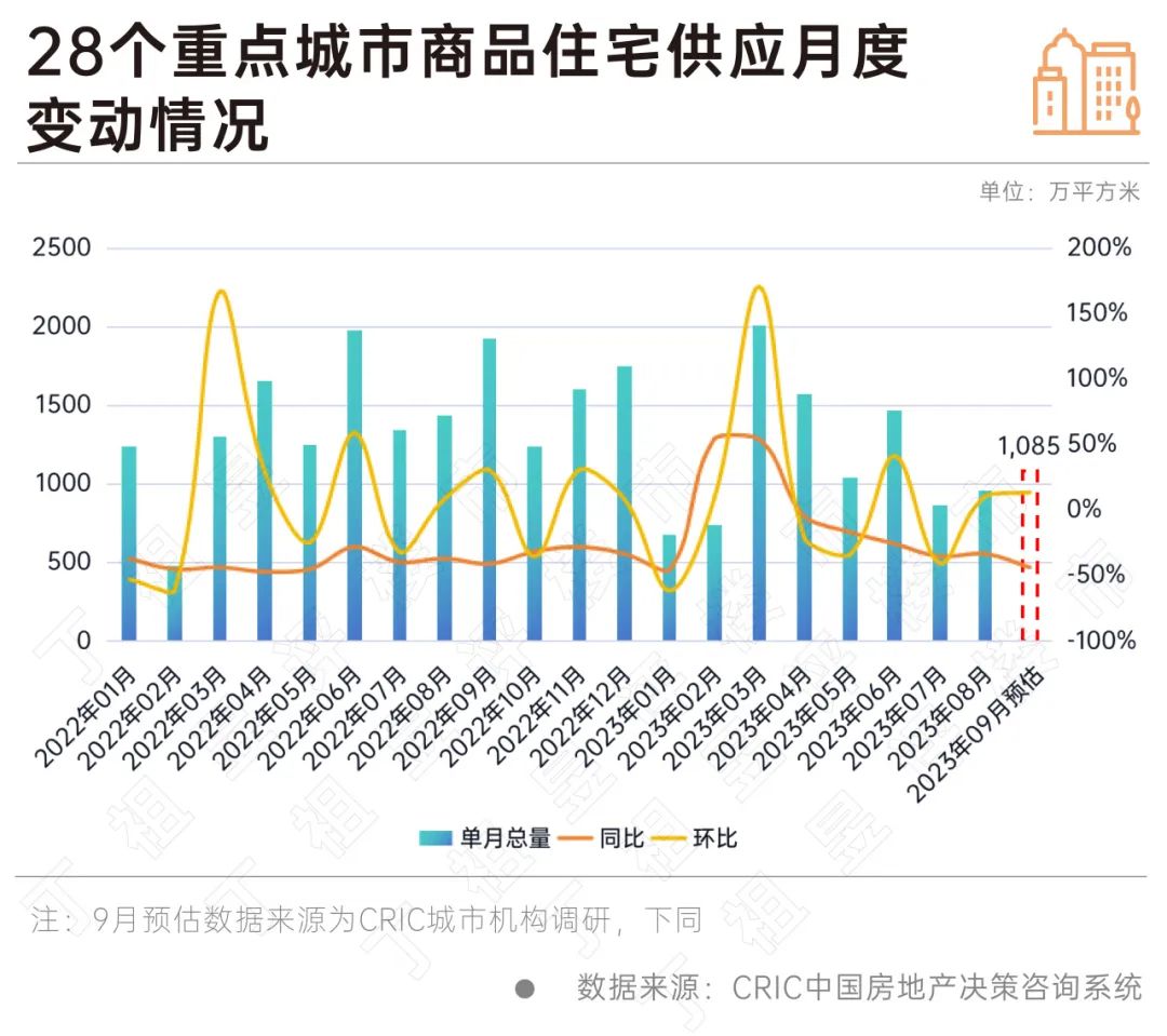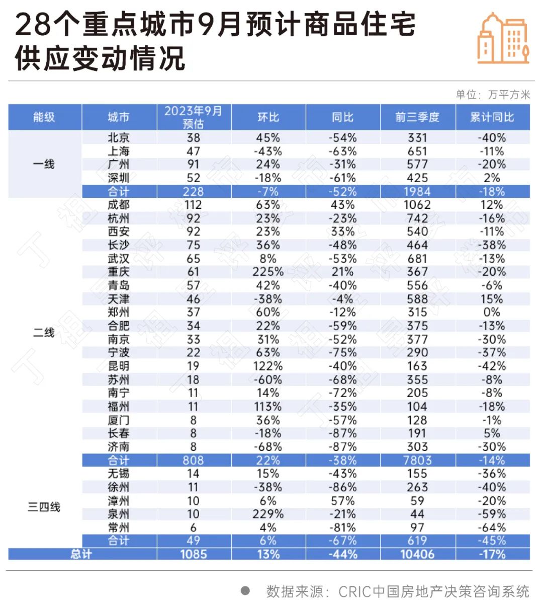 据CRIC调研,9月28个重点城市预计新增商品住宅供应面积1085万平方米,环比上升13%,同比下降44%,前三季度累计供应面积将达到10406万平方米,累计同比跌幅持续扩大至17%。