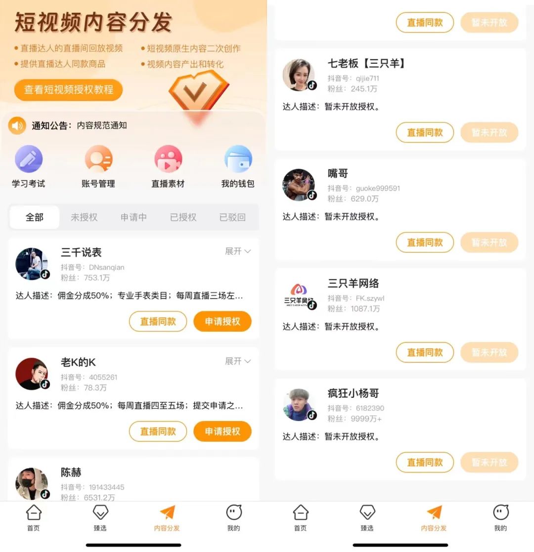 随后你可以在“内容分发”页面看到已开放授权的账号,除三只羊网络和疯狂小杨哥外,还有三只羊签约主播及小杨哥徒弟如小黄、嘴哥、七老板、乔妹等;此外陈赫、交个朋友直播间、郝劭文、朱梓骁等头部主播也已入驻该分发平台。