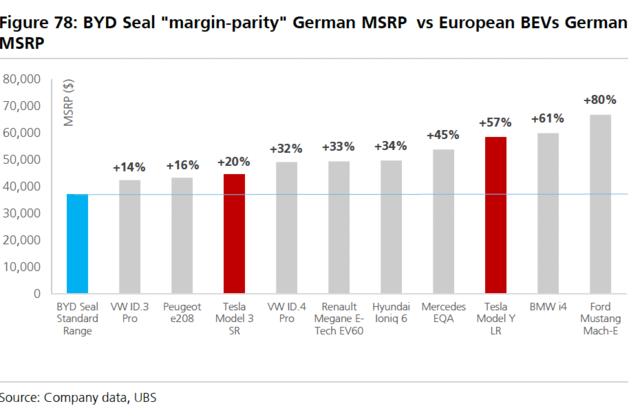 比亚迪海豹汽车(假定在东欧组装)和大众 1D.4(德国制造)的比较来看,在价格持平的情况下,大众每辆车的税前利润将为亏损约1万美元。而如果大众以比海豹汽车高出10%的价格出售,每辆车的亏损仍格达到约7000美元。