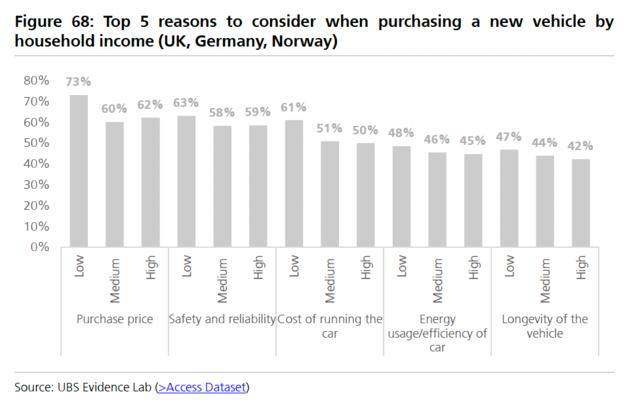 瑞银称,根据调查显示,对于欧洲消费者(以及其他地区的消费者)来说,购车价格是最重要的决策因素,中国的经济型电车很可能会在欧洲市场从传统的燃油汽车转型中抢占大部分份额: