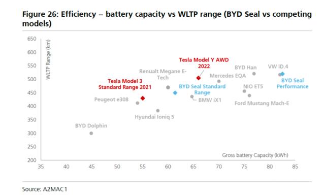 在效率方面(WLTP续航里程与电池容量之比),比亚迪海豹在同级别车型中处于平均水平。特斯拉凭借一流的空气动力学设计和高效的动力系统保持领先。