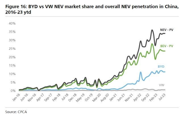 瑞银指出,数据显示,新能源汽车目前占汽车市场的35%,比亚迪在电车领域拥有主导地位,市场份额约为30%。根据2023年Q1的乘用车市场表现来看,比亚迪迎来历史性时刻,首次超越大众,成为中国最畅销的乘用车品牌: