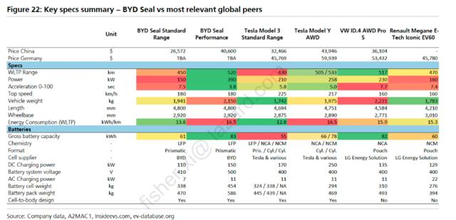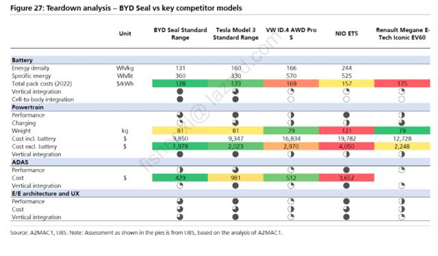 瑞银称,比亚迪可以说是中国电动汽车实力的见证者,成为全球电车市场最新标杆。为了更好地了解中国领先电车制造商的竞争优势和供应链,瑞银拆解了比亚迪最新款海豹汽车,对比亚迪的动力系统进行了详细分析,包括磷酸铁锂(LFP) 电池电池、E/E电气电子系统架构和ADAS智能驾驶辅助系统,并将其与之前拆解的大众ID.3和特斯拉Model 3进行了比较。