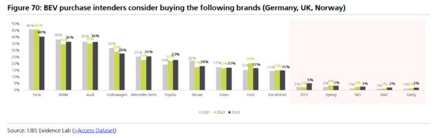 还需要注意的是,在对欧洲电车购买意向者中的调查中,瑞银发现,尽管与欧洲现有品牌相比仍然较低,但在中国本土品牌中比亚迪的市场份额也是最高的,经济型电动车品牌(比亚迪、上汽集团)比高端电动车品牌(如蔚来)表现出更积极的势头。