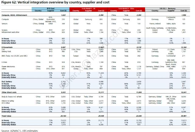 瑞银指出,比亚迪表现出高度的垂直整合优势,海豹汽车中大约75%的零部件是比亚迪自产,留给全球传统供应商的空间是相对比较小的,大量依赖中国的本土供应链,海豹汽车零部件的自制比率要比特斯拉在美国生产、在中国生产或者大众在德国生产更高: