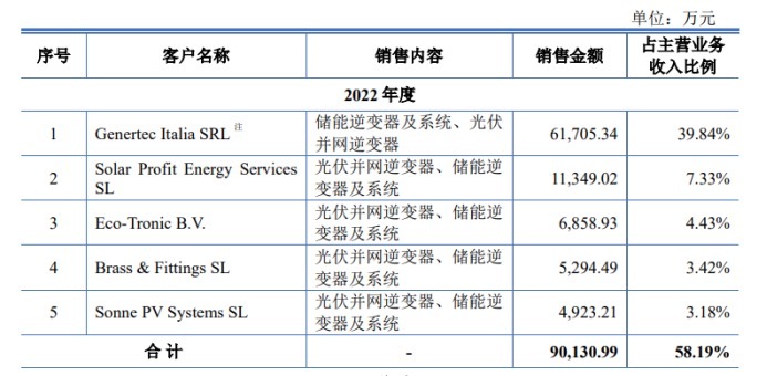 三晶股份的主要客户大多为Genertec Italia SRL、Solar Profit Energy Services SL、Eco-Tronic B.V.、Brass & Fittings SL、Sonne PV Systems SL等国外厂商。其中,Genertec Italia SRL连续两年为第一大经销客户,2022年销售金额达6.17亿,占主业务收入39.84%。