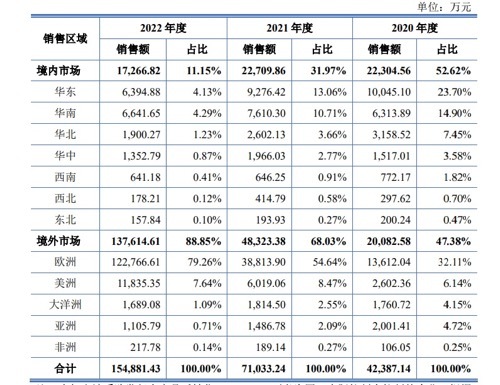 近年来,境外主要国家光伏与储能行业景气度提升,意大利、德国、荷兰等多个国家相继出台政策扶持光储产业布局。三晶股份乘势发展海外,境外销售额大幅增长,三年来从2.01亿元提升至13.76亿元,占比总销售额88.85%。以欧洲为最主要销售区域,主要外销国家包括意大利、西班牙、巴西等。