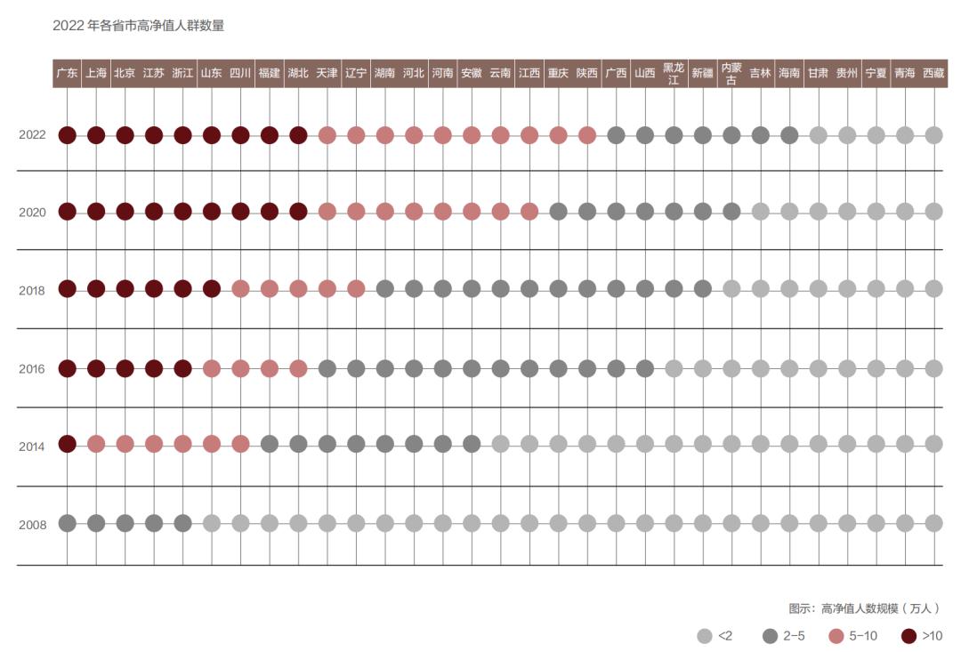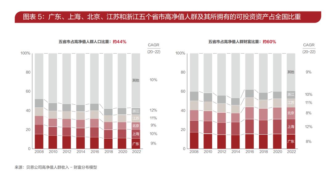 2022年,广东、上海、北京、江苏和浙江五个省市的高净值人群人数占全国总数比例约为44%;其持有的可投资资产占全国高净值人群财富比重约为60%。