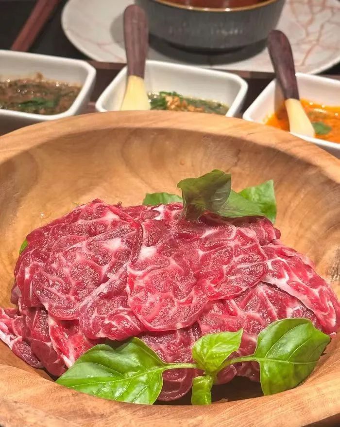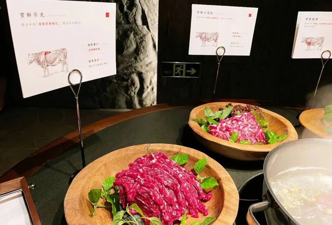 该店餐厅设计风格围绕“木”元素,主打高端牛肉火锅,招牌菜有澳洲巧克力和牛等,有点类似潮汕牛肉火锅,将牛肉进行部位细分,比如雪花、吊龙、匙柄、五花趾,每上一道菜,都会有专业的人介绍牛肉的部位和吃法。