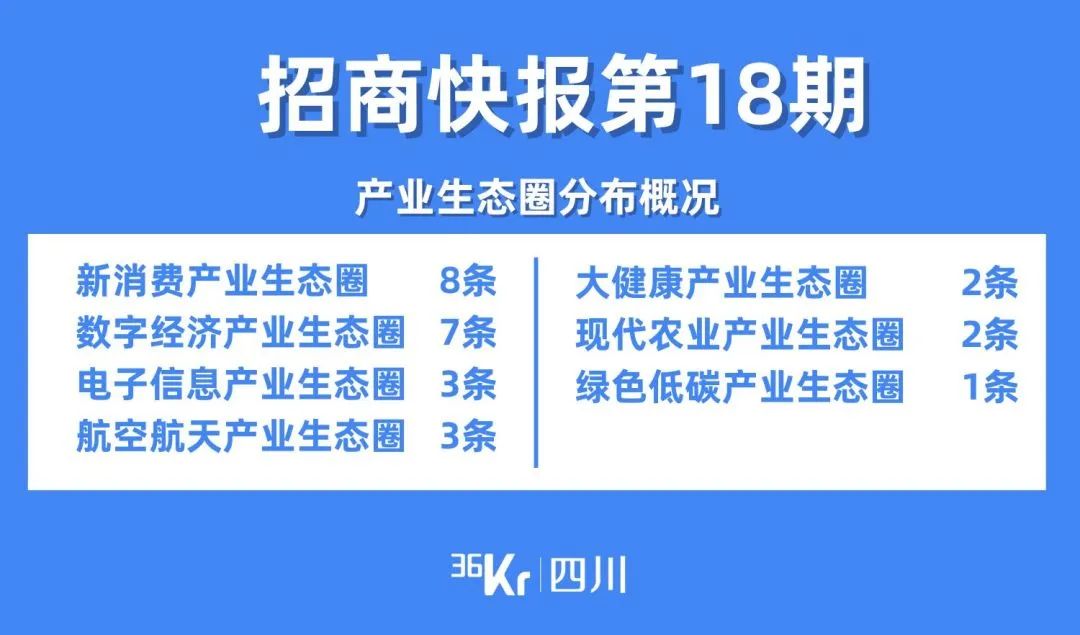 通过对产业生态圈内容的汇总,过去一周的招商动态主要集中在新消费产业生态圈(8条)、数字经济产业生态圈(7条)、电子信息产业生态圈(3条)、航空航天产业生态圈(3条)、大健康产业生态圈(2条)、现代农业产业生态圈(2条)、绿色低碳产业生态圈(1条)。