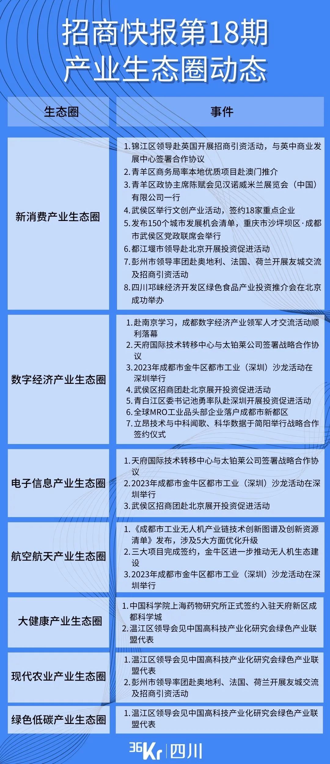 2023年9月7日,36氪四川通过公开渠道,共收录8月31日—9月7日成都市23个区(市)县相关的招商资讯、政策信息23条。
