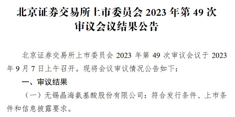 挖贝网 9月8日,在昨日召开的北交所2023年第49次审议会议上,无锡晶海(836547)过会。据介绍,公司是氨基酸生产企业,主要产品支链氨基酸、色氨酸等可应用医药、食品、日化等领域,2023年上半年营业收入2.03亿元,同比增长5.92%。