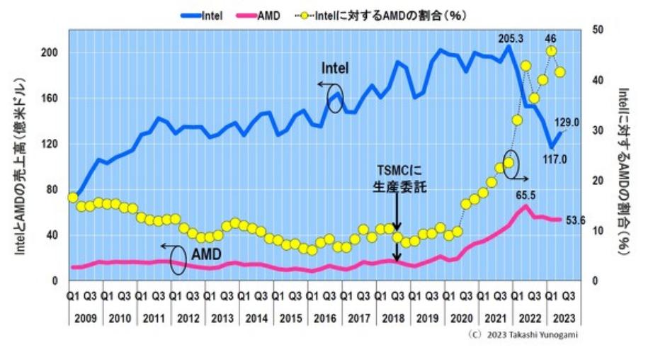 另一方面,直到2017年左右,AMD的销售额还不到英特尔的10%。然而,从2018年第三季度开始将生产外包给台积电后,销售额逐渐上升,到2022年第二季度达到65.5亿美元。