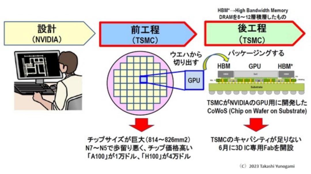 半导体在设计、前工序和后工序三个阶段制造。图13在GPU中,NVIDIA负责设计,TSMC采用“N4”工艺进行前工序制造,后端工艺也采用台积电为 NVIDIA GPU 开发的 CoWoS(晶圆对基板芯片)封装。