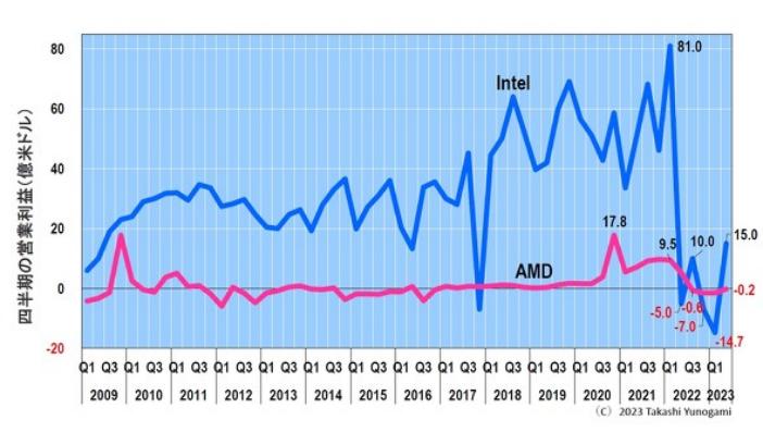 图6显示了英特尔和AMD的季度营业利润。英特尔的营业利润趋势令人震惊。在 2022 年第一季度达到创纪录的 81 亿美元后,第二季度下滑至 5 亿美元的亏损。此后,英特尔的营业利润继续徘徊在红色附近,2023年第一季度降至14.7亿美元的赤字。