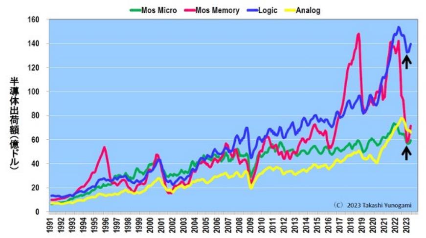 再看图1,我们可以看到Mos Micro、Mos Memory和Logic在2023年4月至5月触底,并正在走向复苏。此外,模拟器件出货量的下降速度似乎已经放缓。