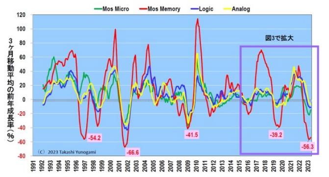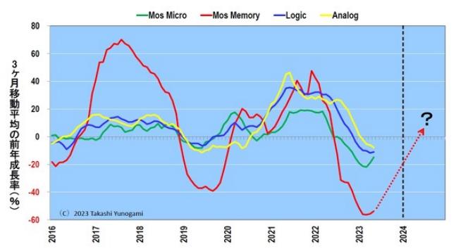 图3: 上一年按类型划分的半导体出货量增长率(3个月移动平均值)(2016年至2023年6月扩展)来源: WSTS