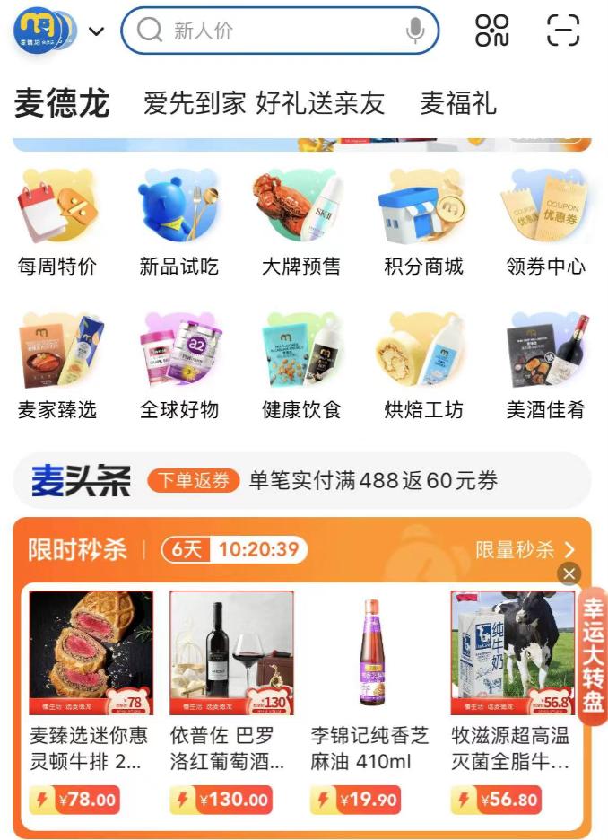 而麦德龙在内容上则直接开启限时秒杀的促销模式。在麦德龙APP每天都会有参与促销的商品,例如,一款麦甄选迷你惠灵顿牛排原价88元,限时秒杀价78元;太太乐鸡精调味料原价19.9元,限时秒杀价17.9元;原价44.9元的千禾酱油,限时秒杀价42.9元等。