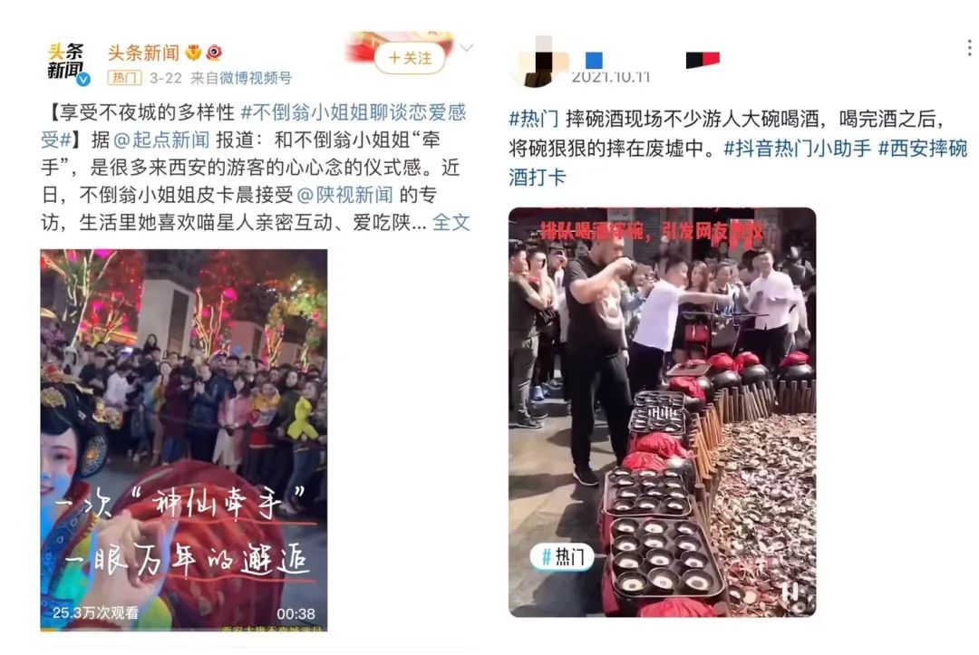 变化出现在2017年底,这一年抖音刚刚面世一年。 有网友在抖音上传了一段15秒的西安摔碗酒视频,获赞上千万,后续引发第一波的西安旅游热,人们蜂拥而至,摔出了上百万碗的“西安摔碗酒潮”。