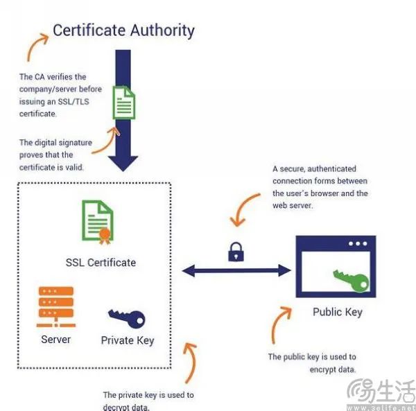 一个常规的数字证书是这样诞生的,首先需要有一个数字证书认证中心(Certificate Authority)来作为权威、公正、 可信赖的第三方来负责签发,并使用非对称加密技术来产生一对公钥和私钥,然后用自己的私钥对自己的公钥进行签名,生成所谓的一份公开文件。该文件中就会包含签发该证书的CA、有效期、签发对象,而这些则都是未加密的明文。