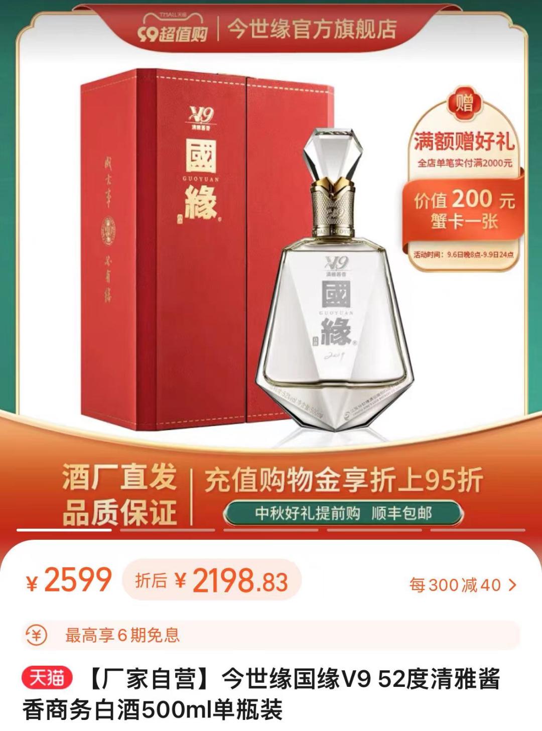 值得一提的是,作为今世缘唯一的超高端产品,国缘V9定价2599元(天猫平台折后价2198.83元),也是公司旗下唯一一款酱香型白酒。