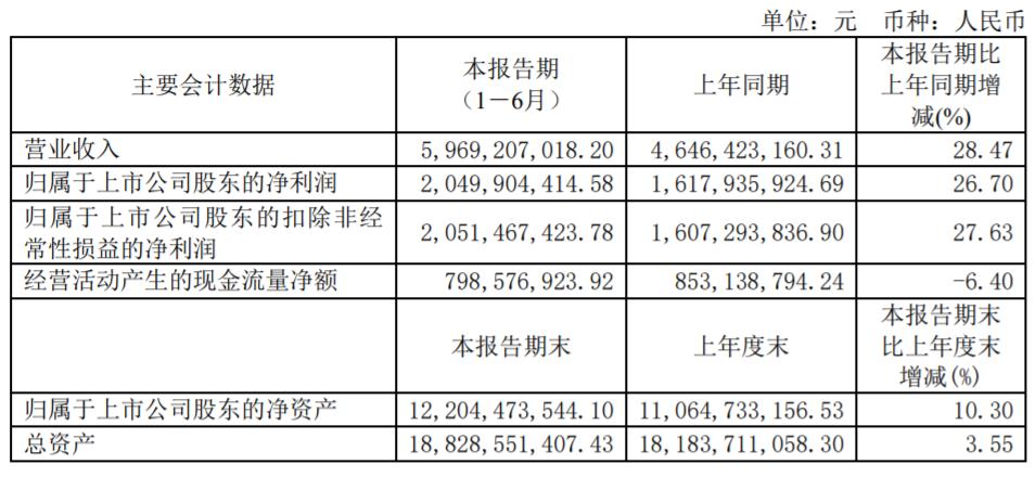 今世缘近期披露的2023年半年报显示,期内实现营收59.69亿元,同比增长28.47%;实现净利润20.50亿元,同比增长26.70%。