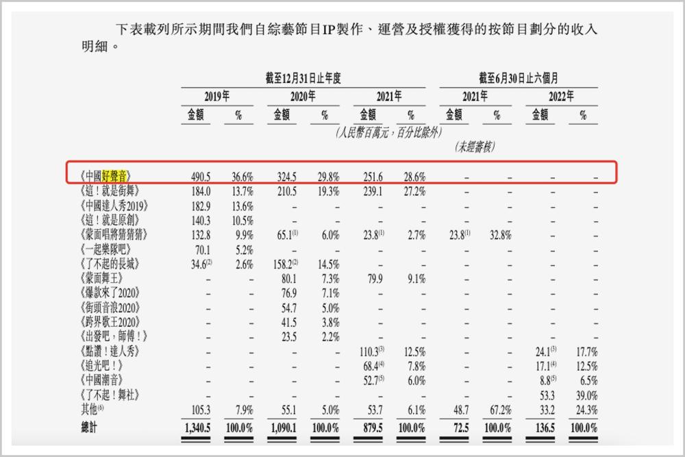 2019年,华文星空来自《中国好声音2019》的收入达到4.9亿元,占营收比为36.6%;2021年来自《中国好声音2021》的收入只剩下2.52亿元,占营收比28.6%。