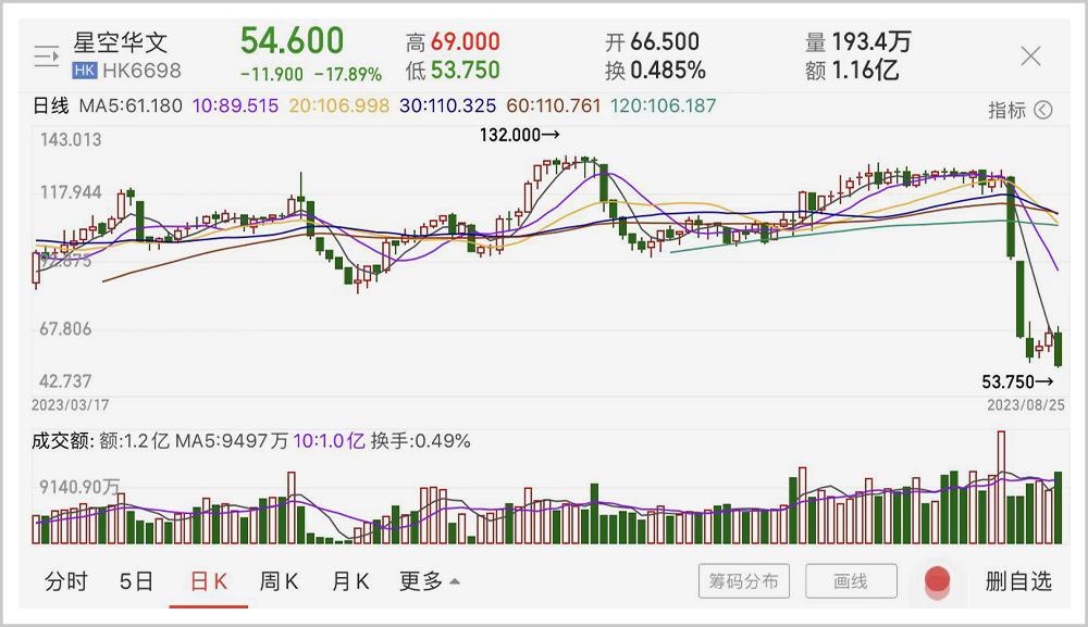 8月18至22日,李玟录音曝光后的三个交易日内,星空华文股价从124.5的高点腰斩至55.35的低点,短暂回升后,随着《好声音》的停播,8月25日,公司股价再次暴跌至54.6。总市值合计蒸发近260亿元人民币。