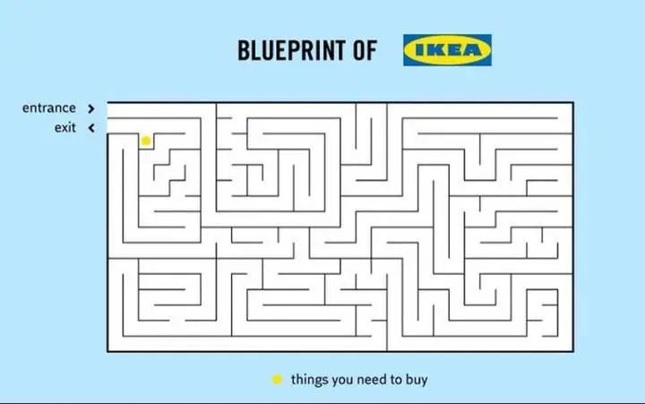 宜家迷宫式的单动线设计,至今被奉为体验式消费的经典,准确地说它也不算真正的迷宫,而是肠式布局或迂回路线,入口到出口是一条曲折的主路,搭配几处较为隐蔽的捷径。