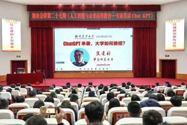 湖南农业大学在春季开学第一课率先讲解了相关知识,在2023年度开年首场湘农会讲以“ChatGPT前沿研究论坛”为主题,并邀请了华南师范大学教育信息技术学院焦建利教授就 “ChatGPT来袭,大学如何接招?”作主题报告。