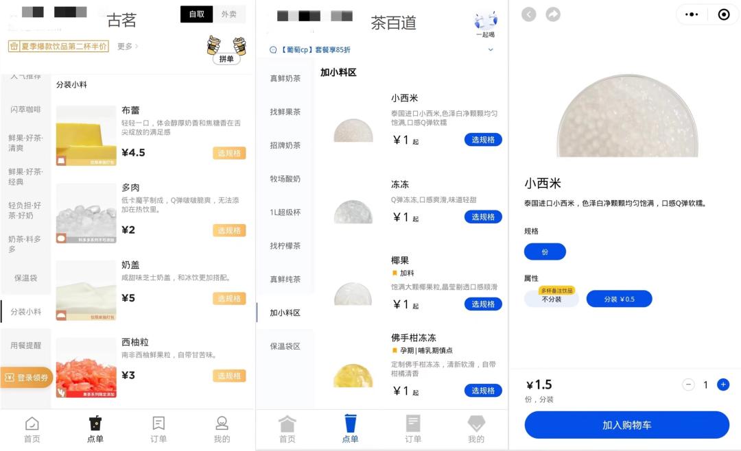 茶百道的小料区有小西米、冻冻、椰果、佛手柑冻冻、芋圆、脆啵啵等13种配料;古茗的分装小料,则自成一个菜单项。