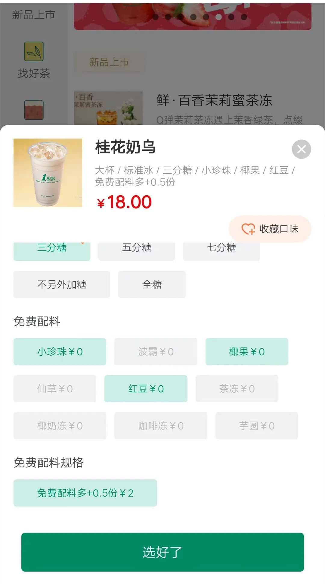 打开1点点点单小程序,选择产品进行点餐,在原有杯型、冰度、糖度、免费配料等基本选项外,多增加了一个“免费配料规格”选项,具体是:免费配料多+0.5份,收费2元。