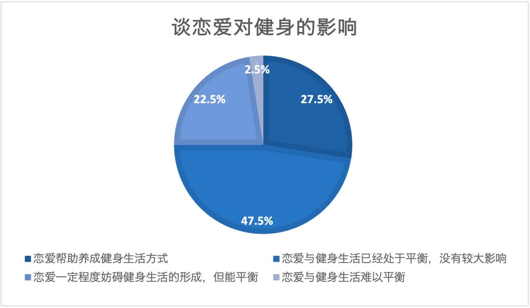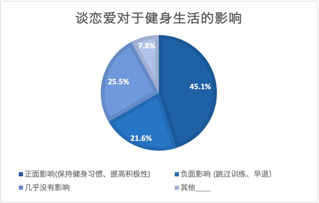 虽然恋爱生活会影响原先的健身计划,但90%男性单人健身者的健身生活方式表示恋爱并没有对健身生活方式有负面影响,甚至近半数有更高的积极性去锻炼,而锻炼发生的事也能成为恋爱的话题。