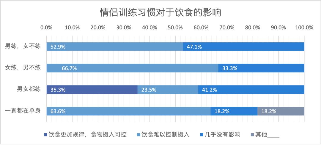 饮食上,一起控制一起浪,控制失败甩锅对方。在参与调查的17对「健身情侣」中,35.3%的情侣拥有更加规律、可控的饮食,仅有23.5%的情侣陷入美食的诱惑。