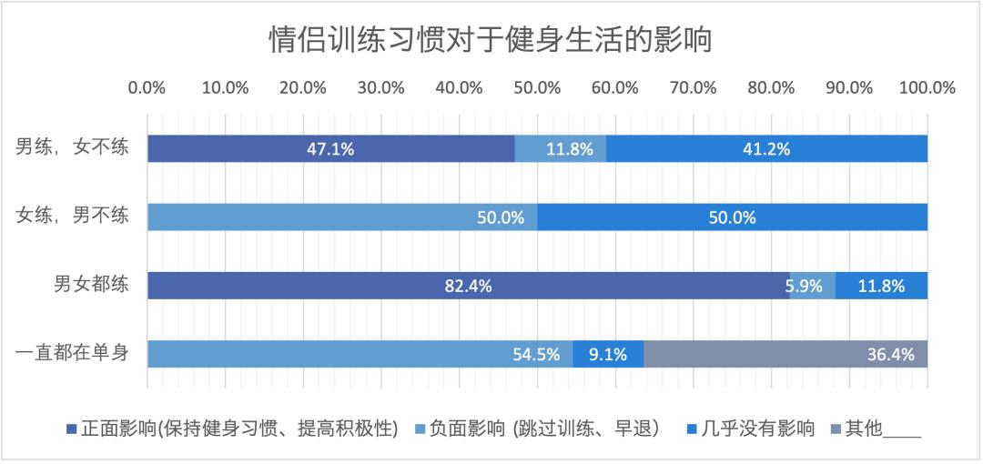 反之,恋爱也会给人带来更多的惰性和逃避痛苦训练的借口,比如在「女练,男不练」的情况下,有50%的人认为健身生活方式受到了恋爱的负面影响。