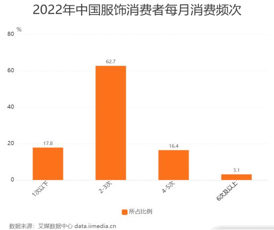 iiMedia Research(艾媒咨询)数据显示,在2022年中国服饰消费者每月消费频次中,62.7%消费者会购买2-3次,17.8%消费者会购买1次以下,16.4%消费者会购买4-5次,3.1%消费者会购买6次及以上。