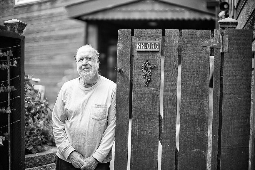 《宝贵的人生建议》作者 K.K. ,门上是他的网站地址 PHOTO BY CHRISTOPHER MICHEL