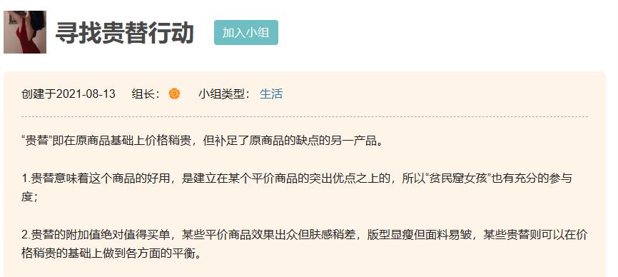 在小红书上,关于“贵替”的笔记已多达两万余条,而在豆瓣小组“寻找贵替行动小组”也有不少寻找裙子、包、化妆品甚至食品饮料的“贵替帖”。比如,星巴克“冰摇红梅黑加仑茶”成为每日味C葡萄味的贵替,Diptyque的“肌肤之花”香水则成为六神花露水的贵替,香奈儿、纪梵希等品牌的口红则成为INTO YOU和花知晓的贵替……