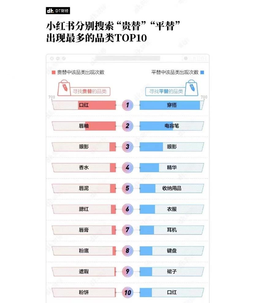 而DT财经统计了小红书热门“贵替”笔记中提到的相关产品,结果显示“热度最高的产品都是美妆个护,口红是出现次数最多的产品,而除了唇部化妆品,眼影、香水、腮红等产品也是搜罗贵替的热门之选。”