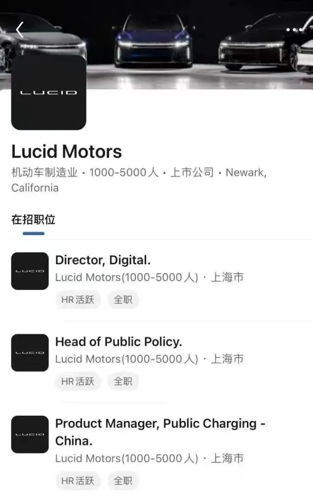 2022年5月,有消息称Lucid已经招聘中国区HR负责人。2022年12月,Lucid发布招聘信息,岗位涉及软件工程、公共政策、法律顾问、本地化工程、数字化、物流、供应、住宅充电产品等多个领域。